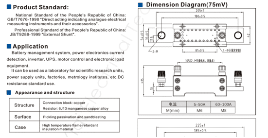 Standard resistors, standard shunts, shunts, precision shunts, 0.01 ,0.02class shunts, 0.05 class shunts, power shunts, ultra-optical shunts, metering shunts, high-current standard resistors, widely used in electrical research Institutions, factories, schools, laboratories, and measurement and testing institutions are used as the standard for DC resistance, and can be used by power supply manufacturers and shunt manufacturers as the standard resistance of DC shunts.